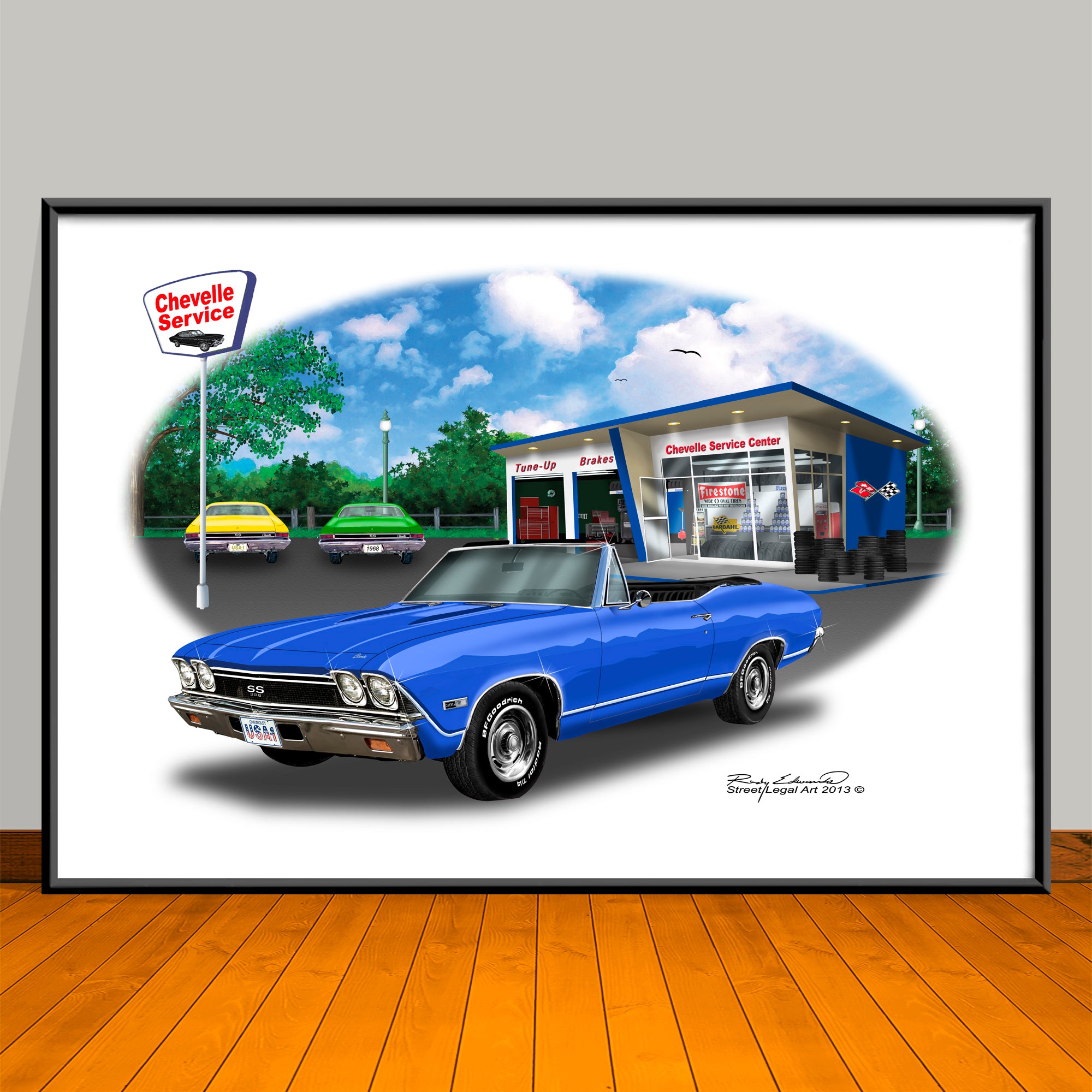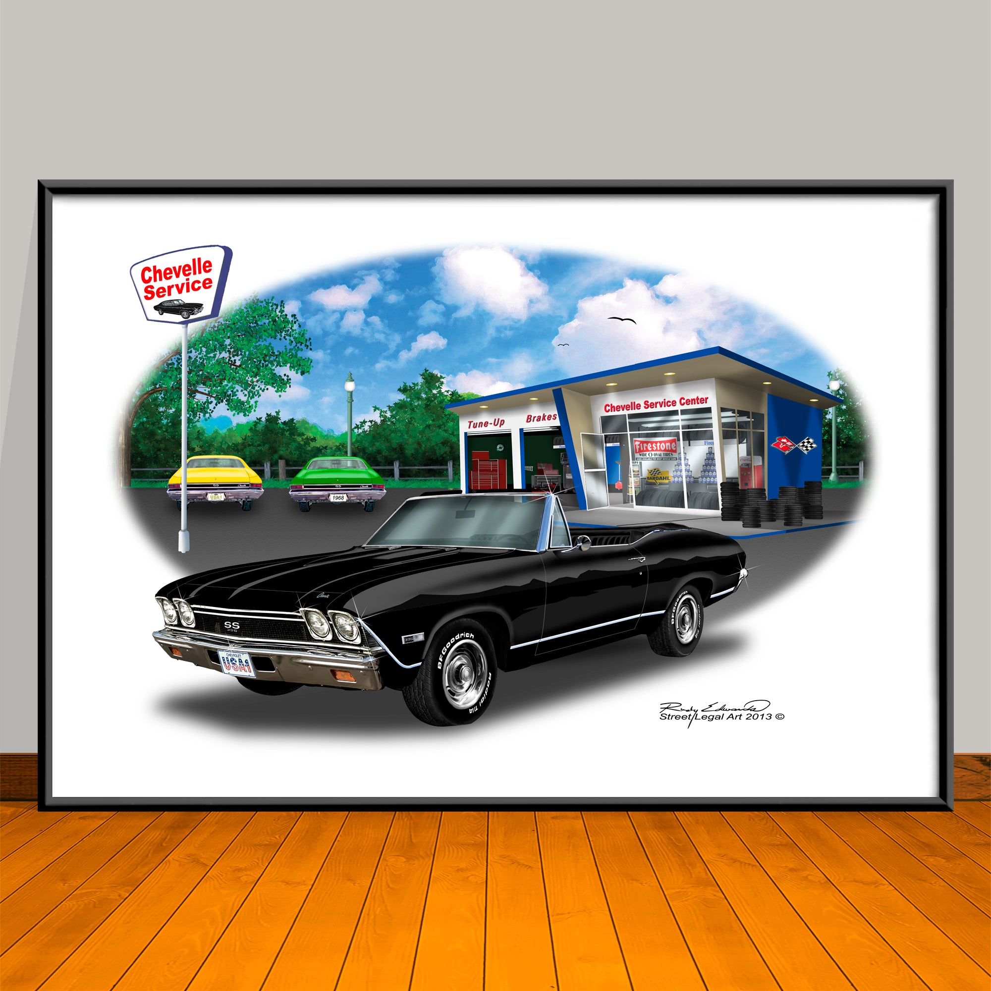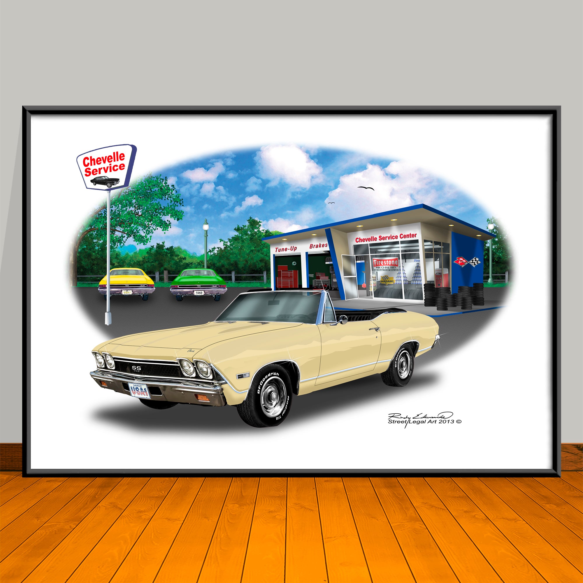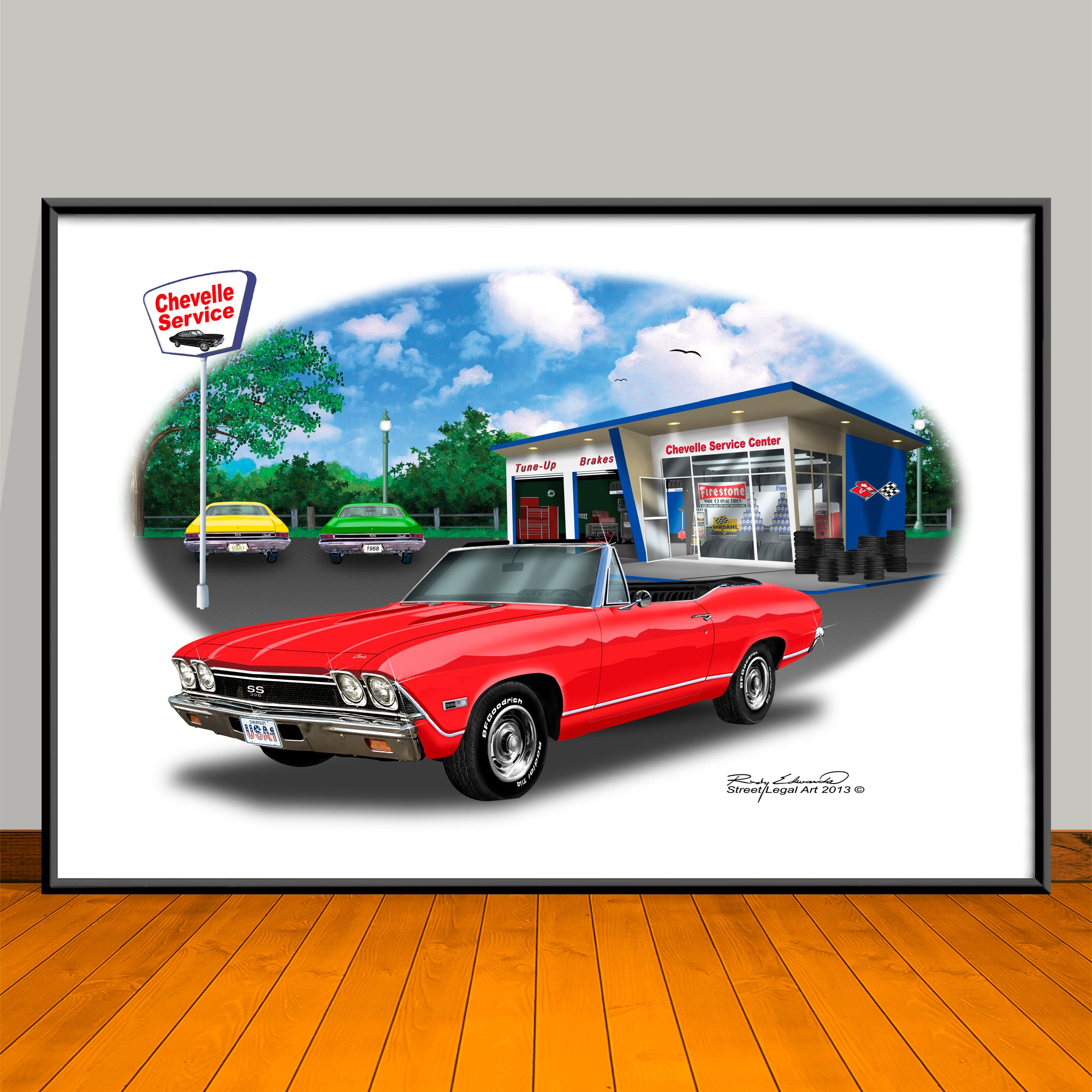 Celebrate American muscle with bold automotive art prints, created in Photoshop by Rudy Edwards. Each design captures legendary cars in vivid detail with nostalgic backdrops like garages, gas stations, and city skylines.