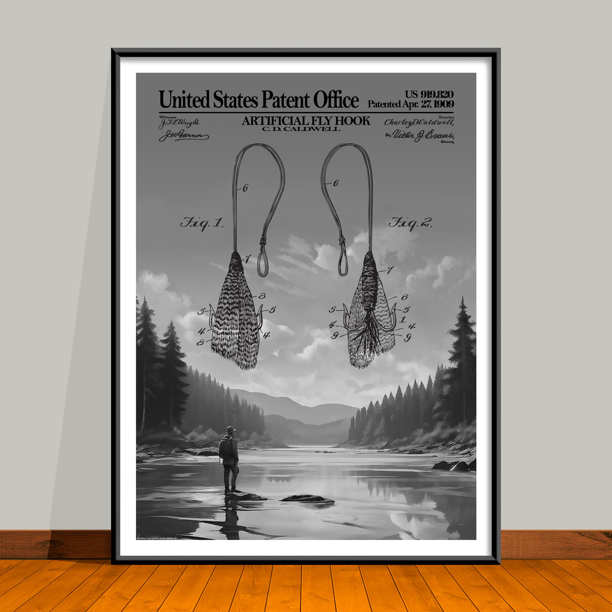 The 1909 U.S. artificial fly hook patent drawing by C.D. Caldwell, sourced from the public domain and creatively reimagined to blend seamlessly with a fishing-inspired illustration. Each backdrop begins with AI-generated concept art based on my ideas and prompts, then is hand-refined in Photoshop for rich detail, depth, and character.