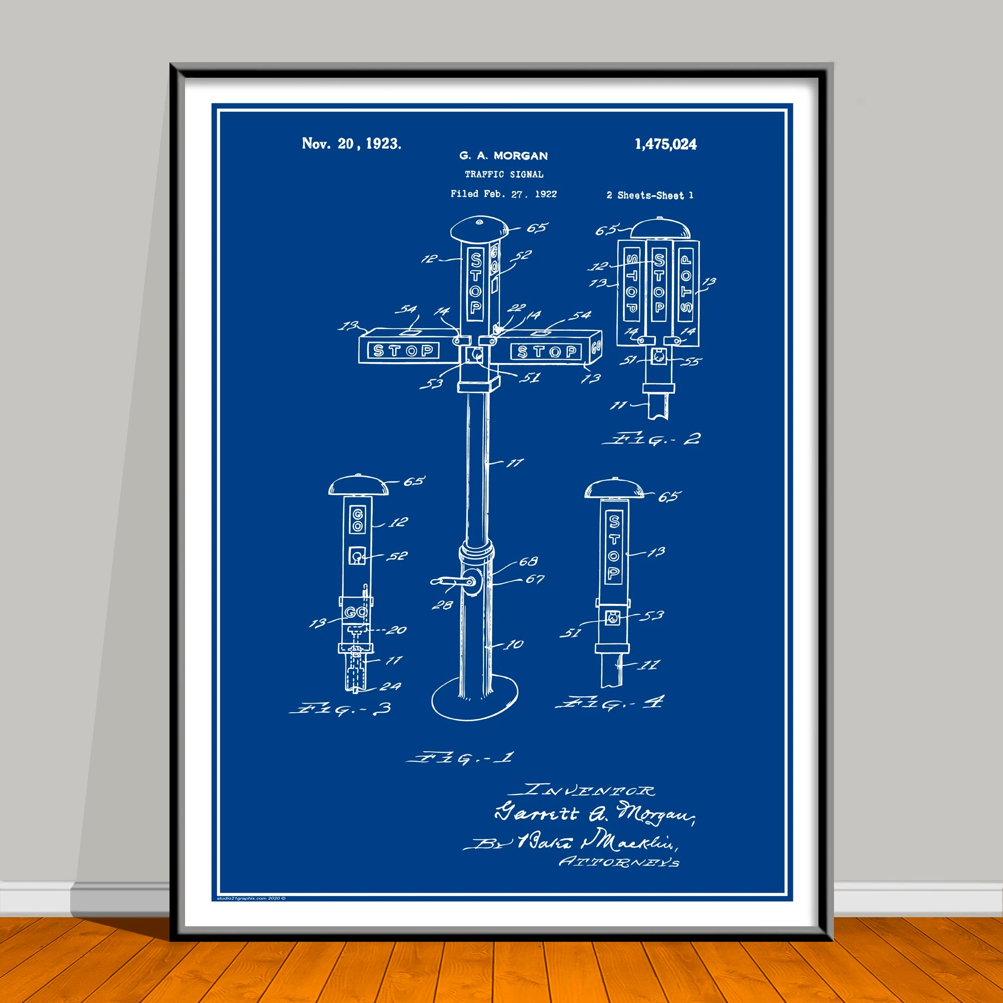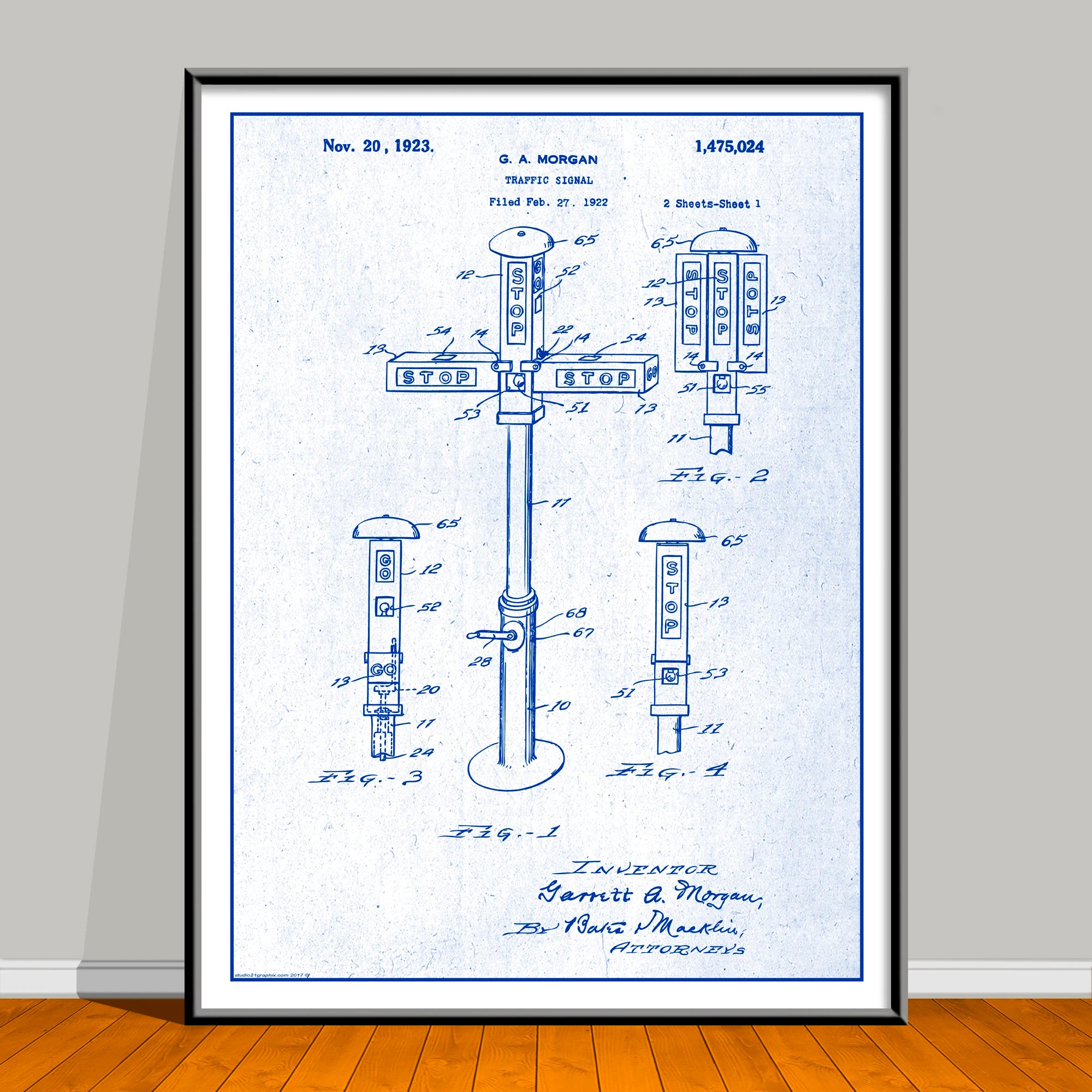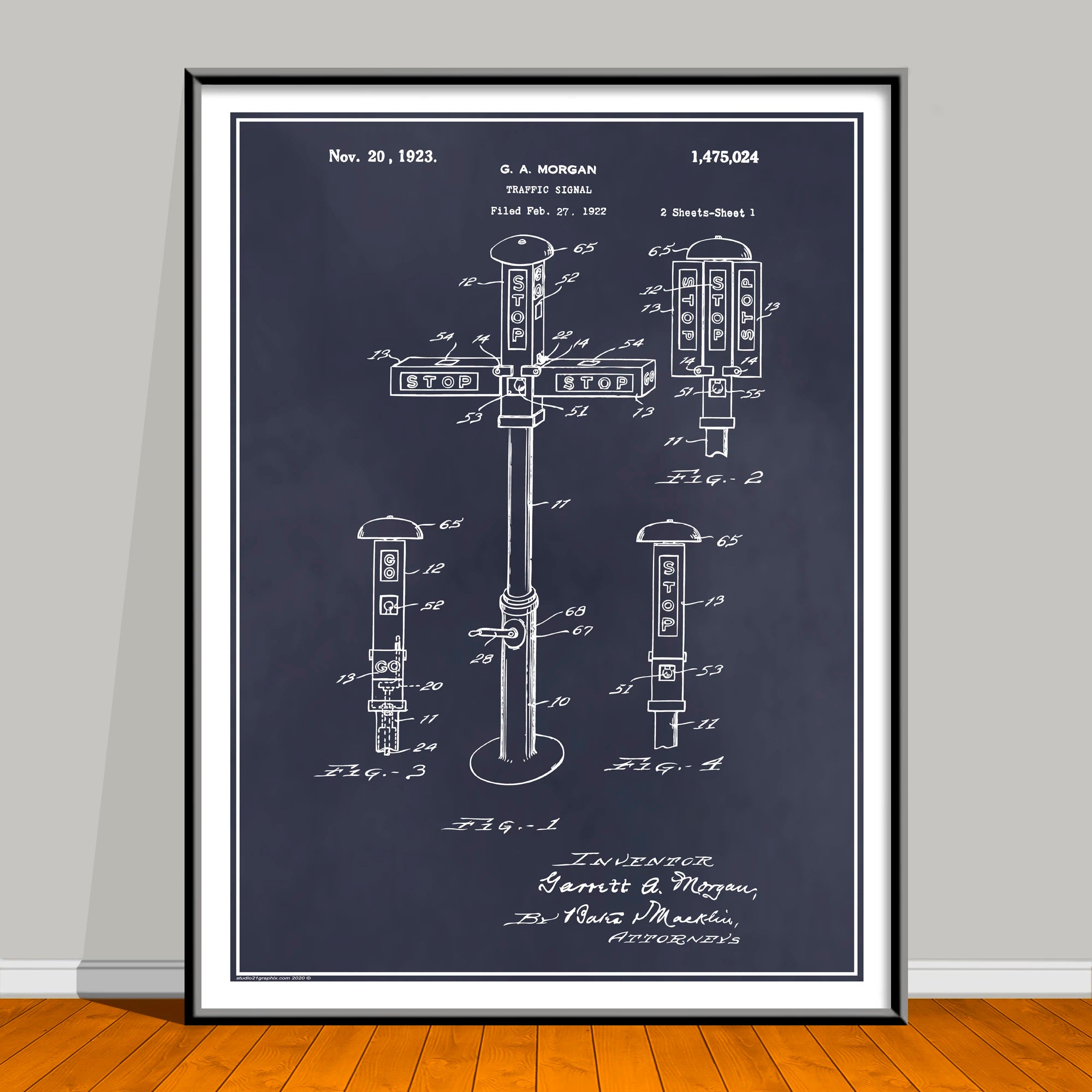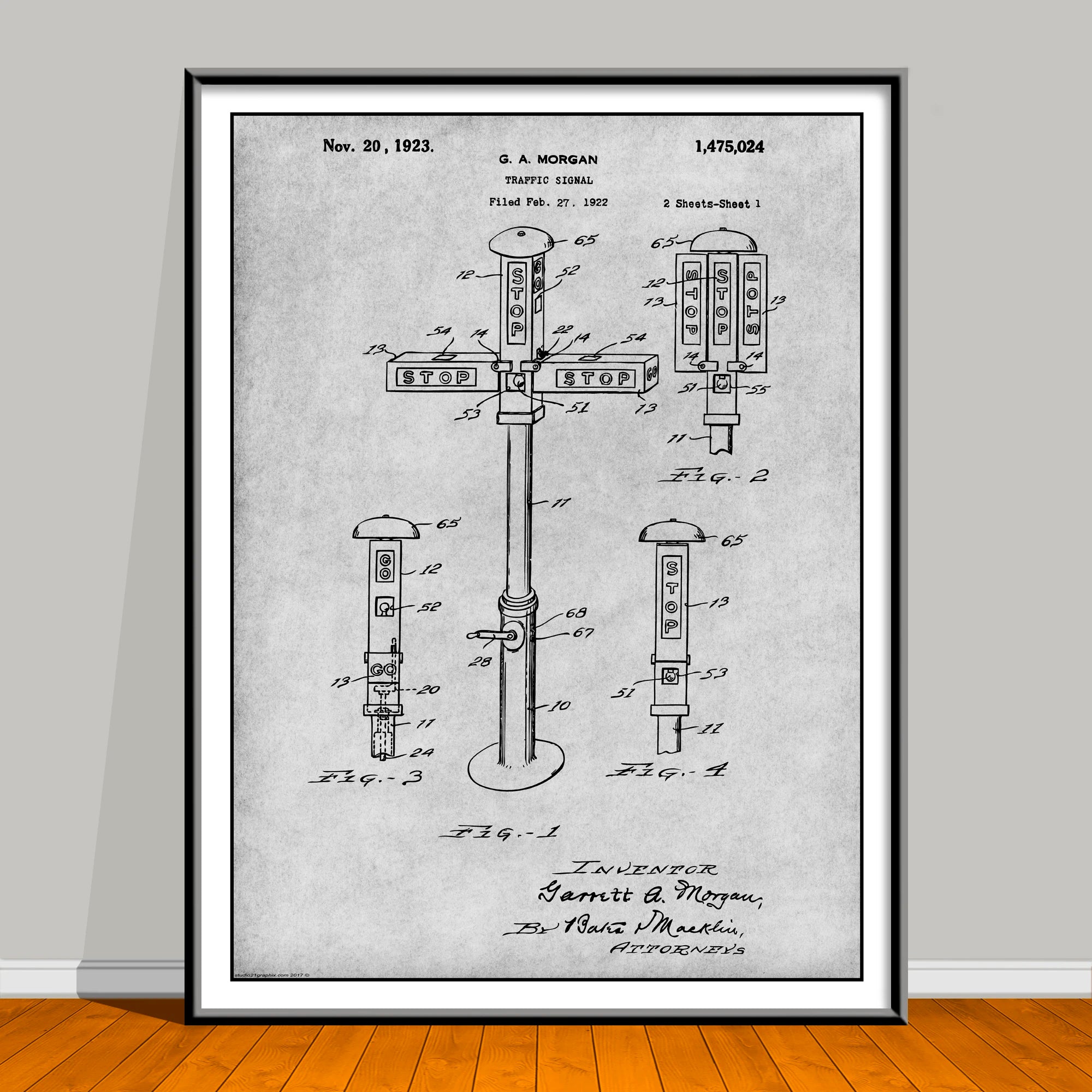 Celebrate Black History Month all year with this striking African American Patent Print featuring trailblazer G.A. Morgan. Based on an authentic U.S. patent sourced from the public domain, this piece has been carefully restored and artistically enhanced in Photoshop for a bold, modern look—while honoring the groundbreaking innovation behind the original design. This artwork is not affiliated with, endorsed by, or connected to any brand, company, or trademark owner.