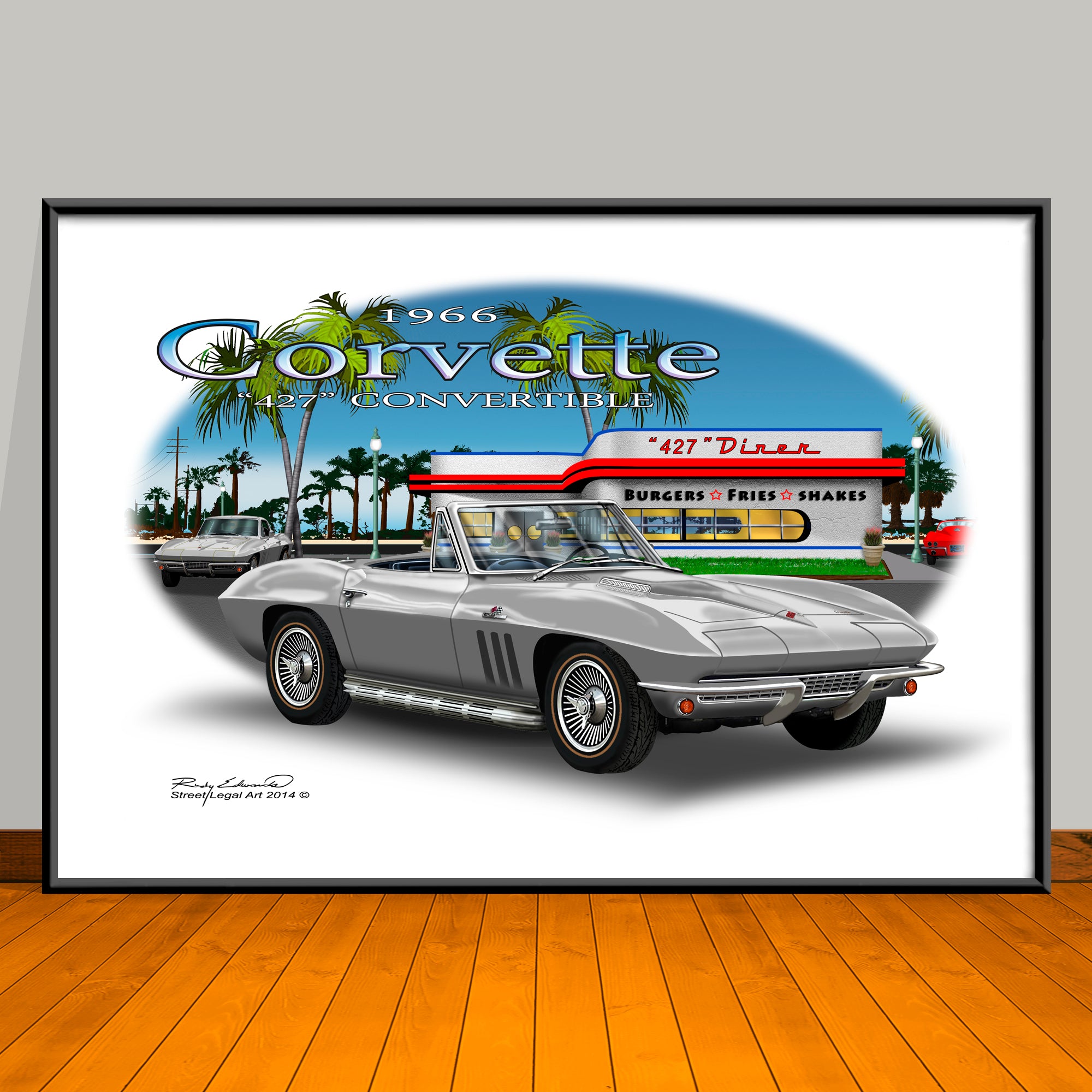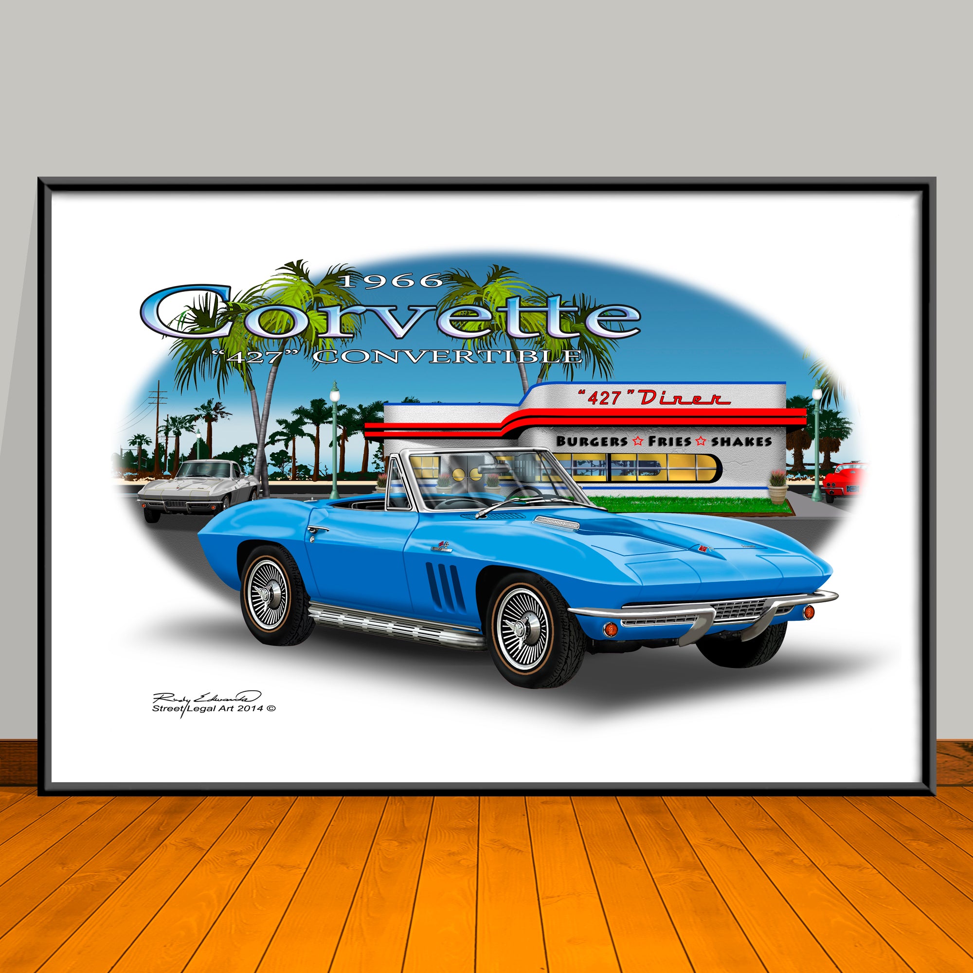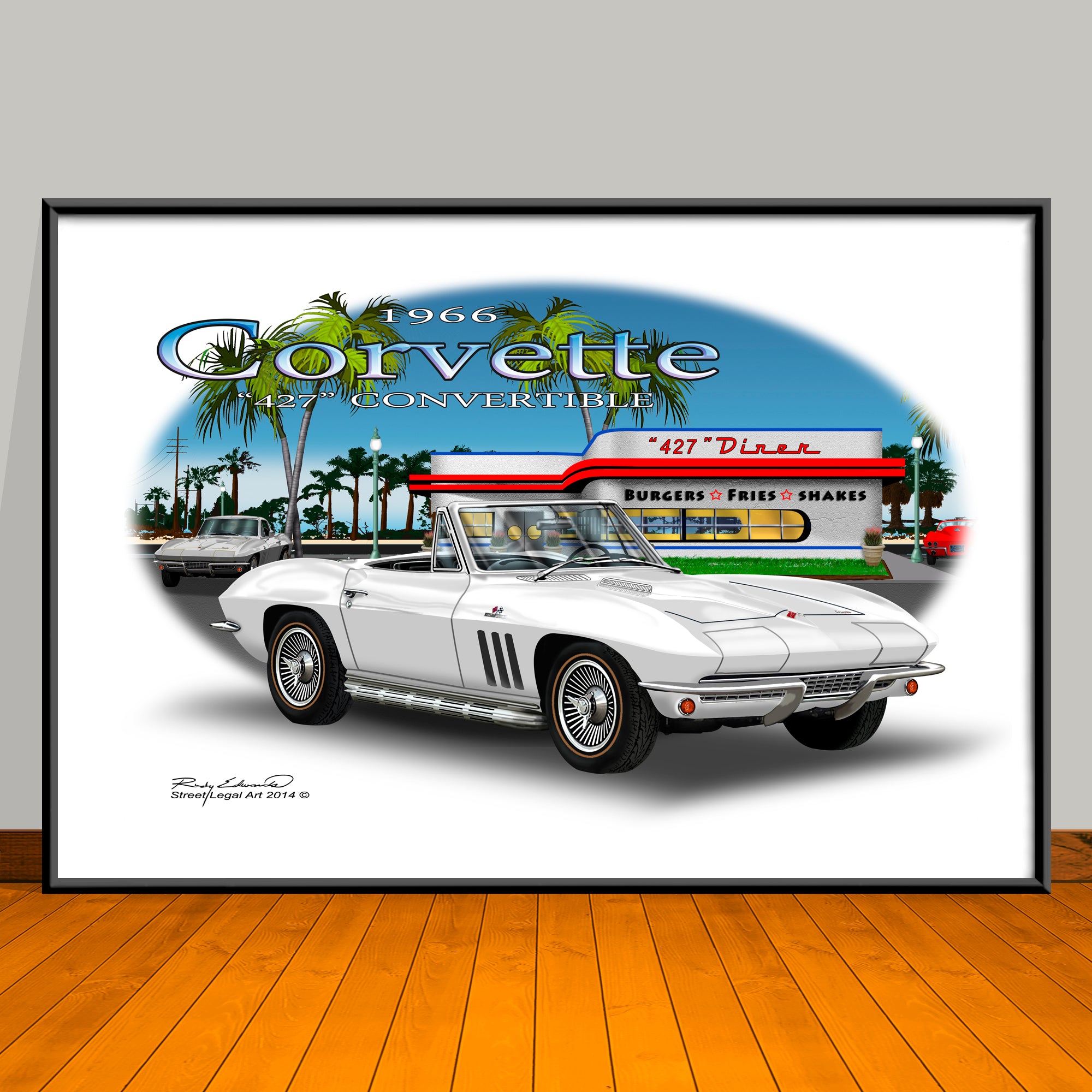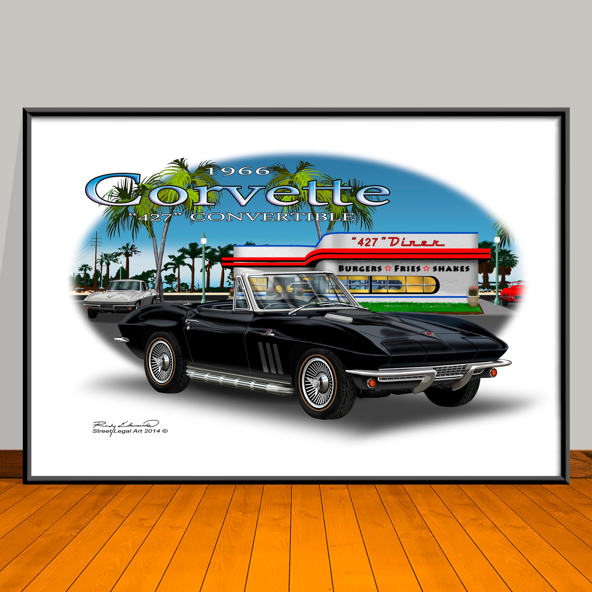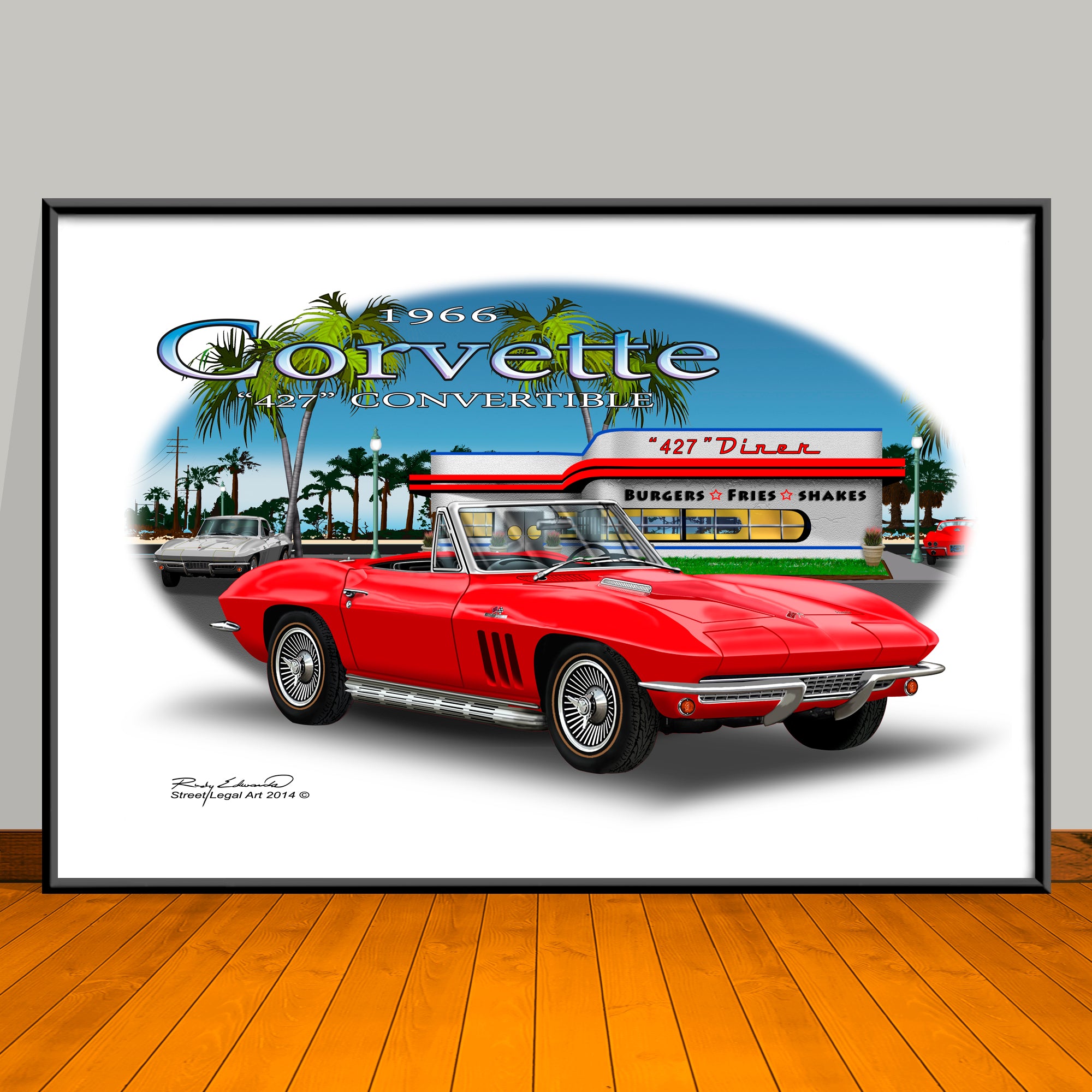 1966 Corvette Convertible Diner Car Art Print - 13" X 19" UNFRAMED