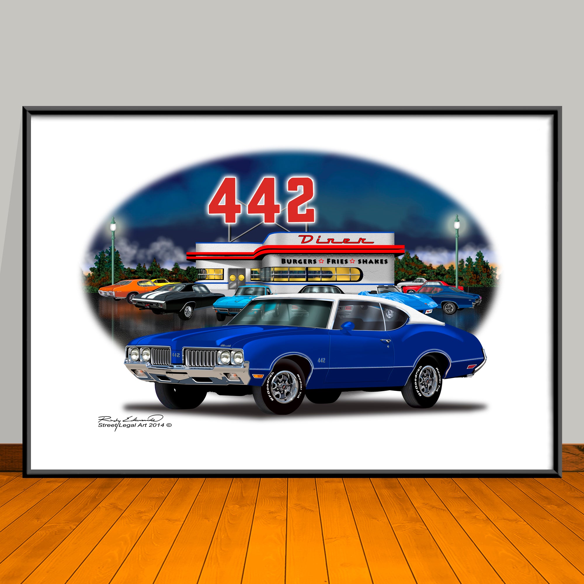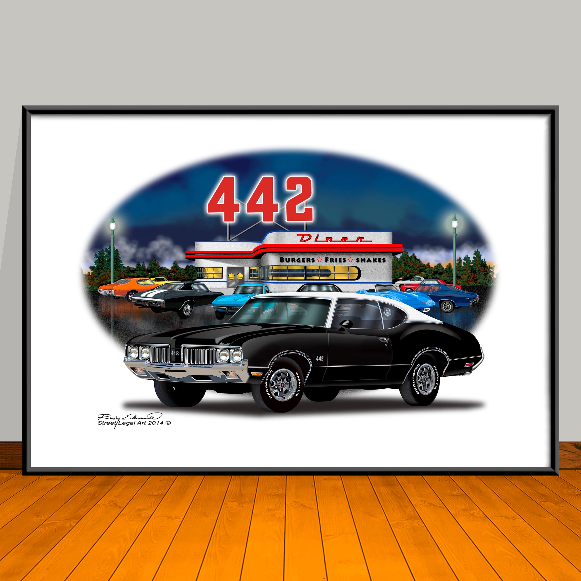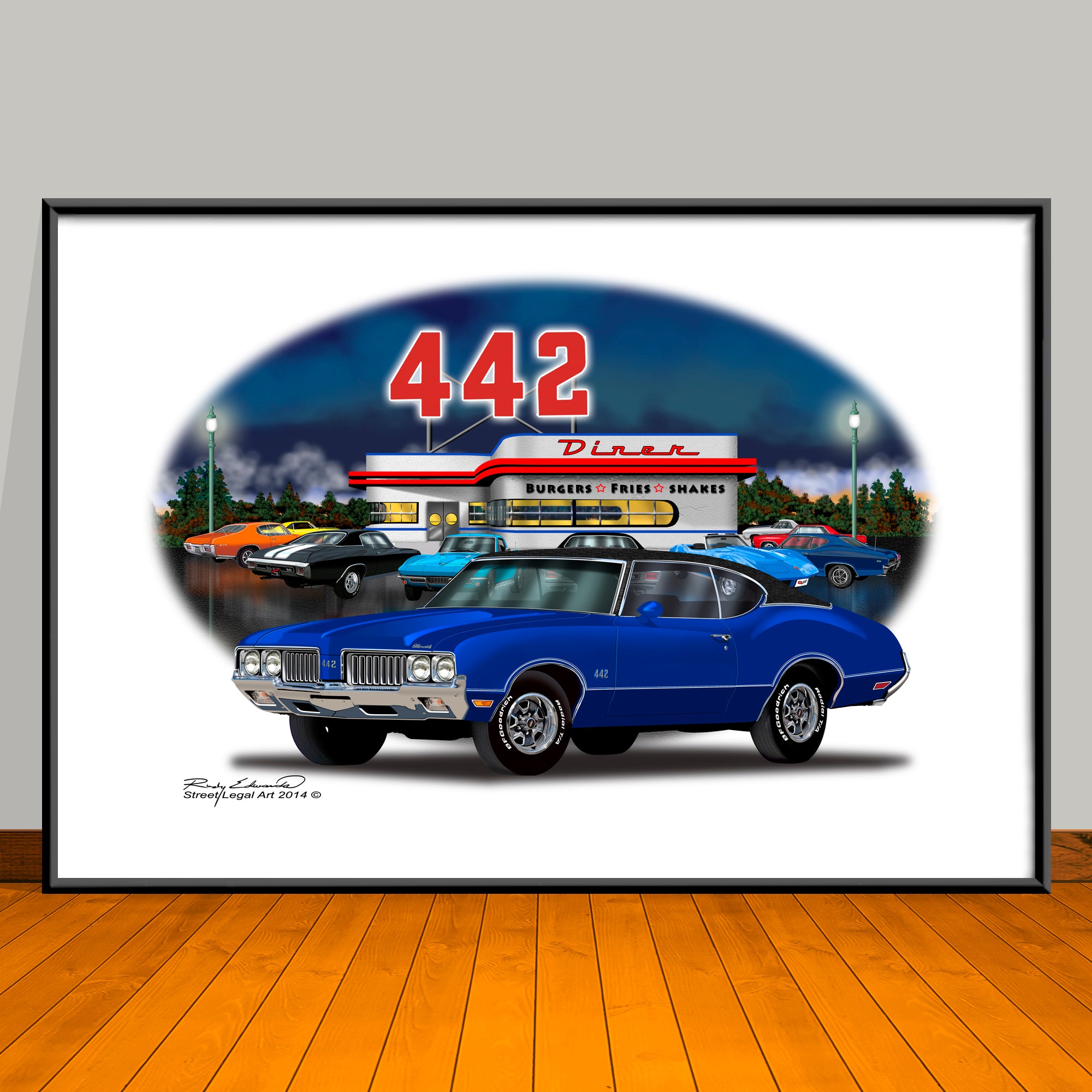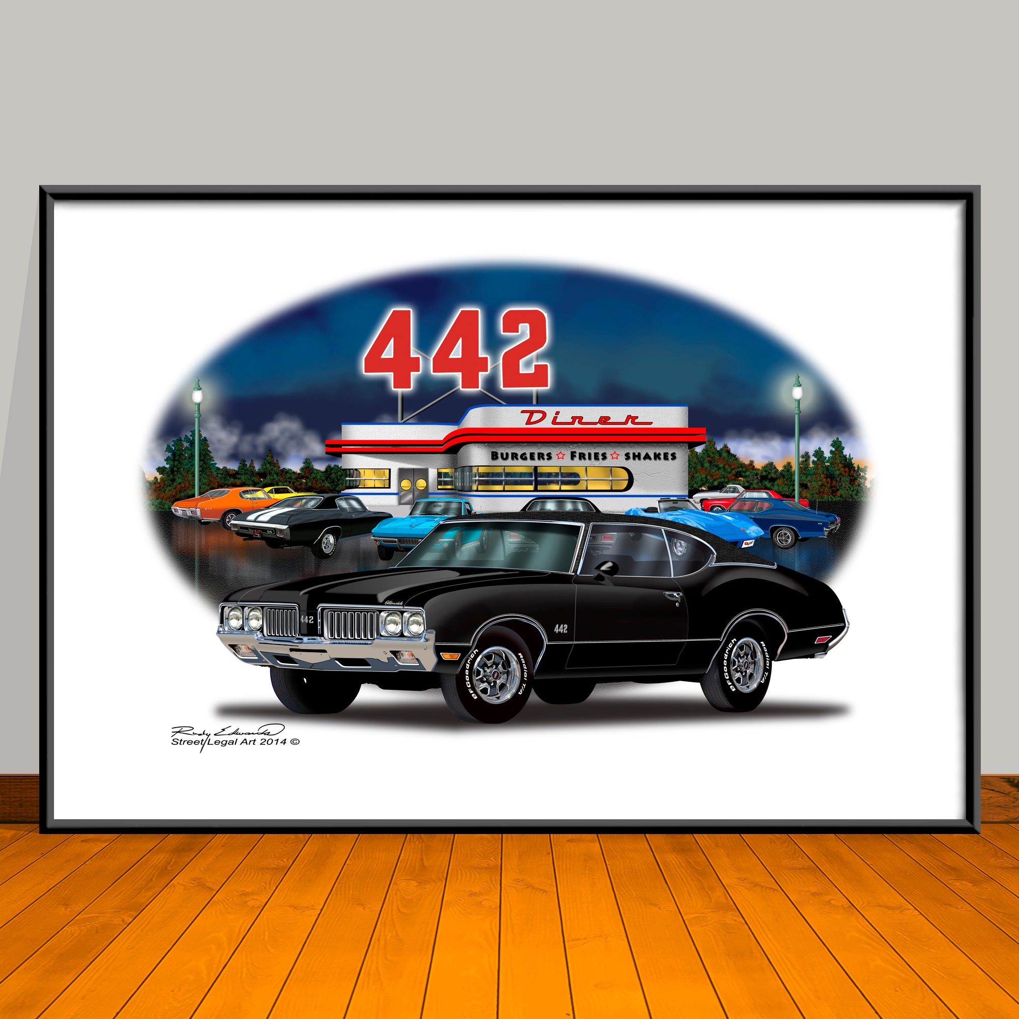 1970 Oldsmobile 442 Diner Vinyl Top Muscle Car Art Print - 13" X 19" UNFRAMED