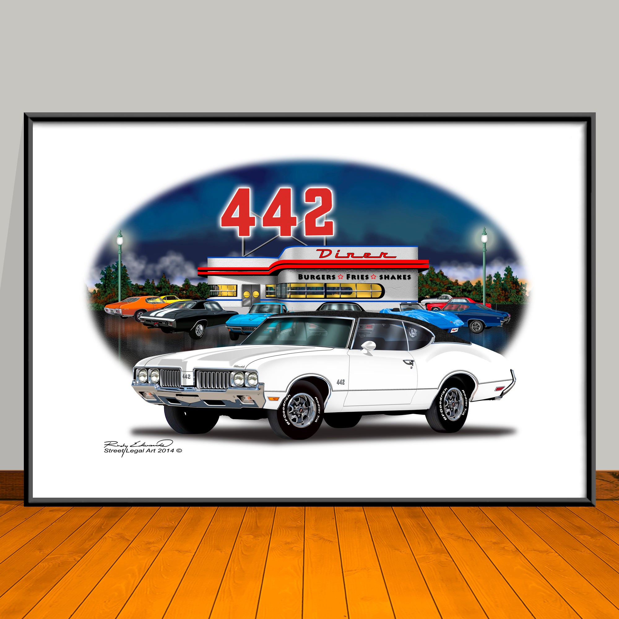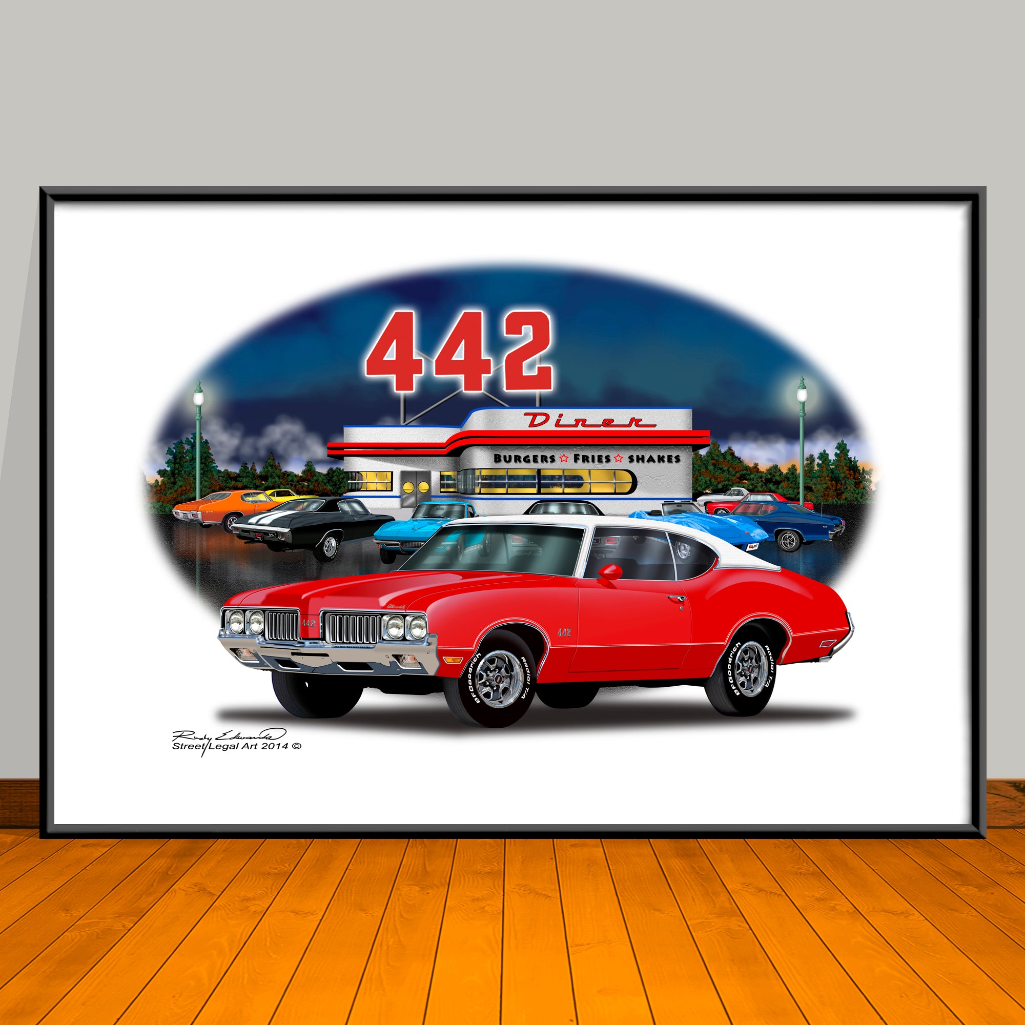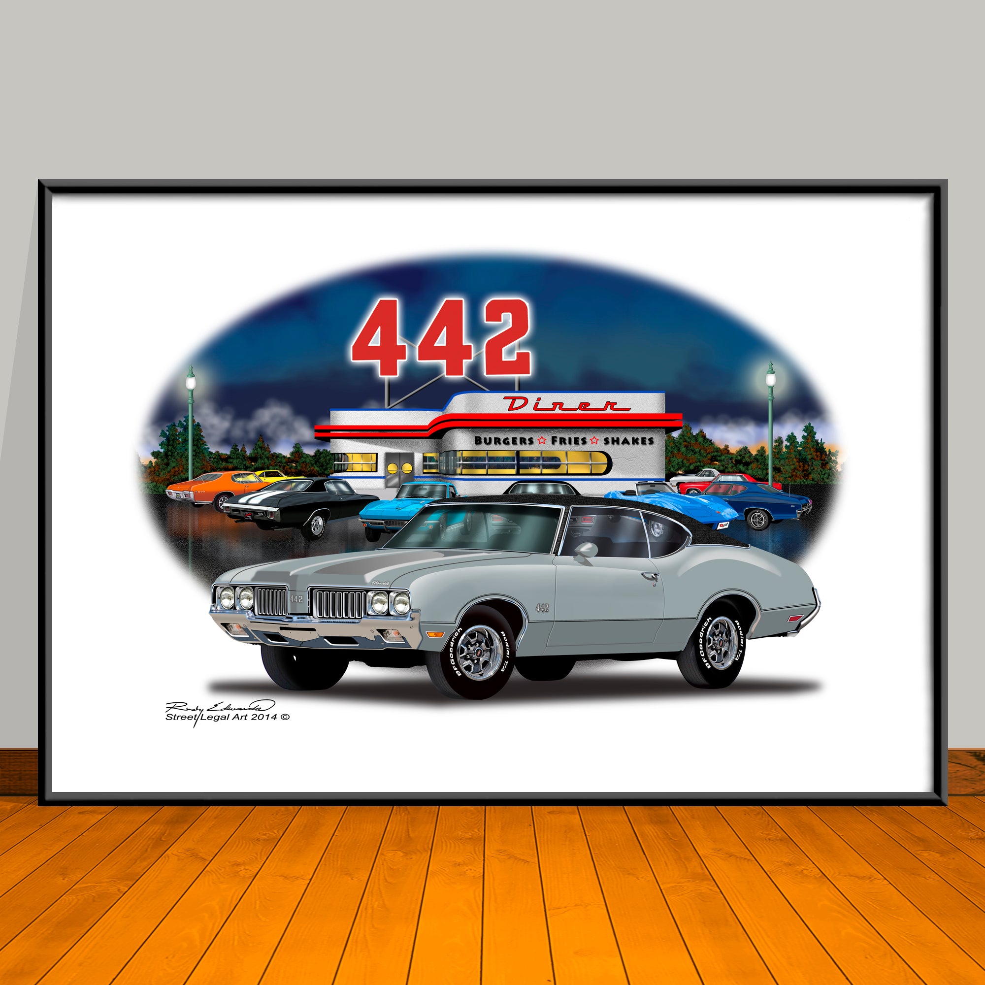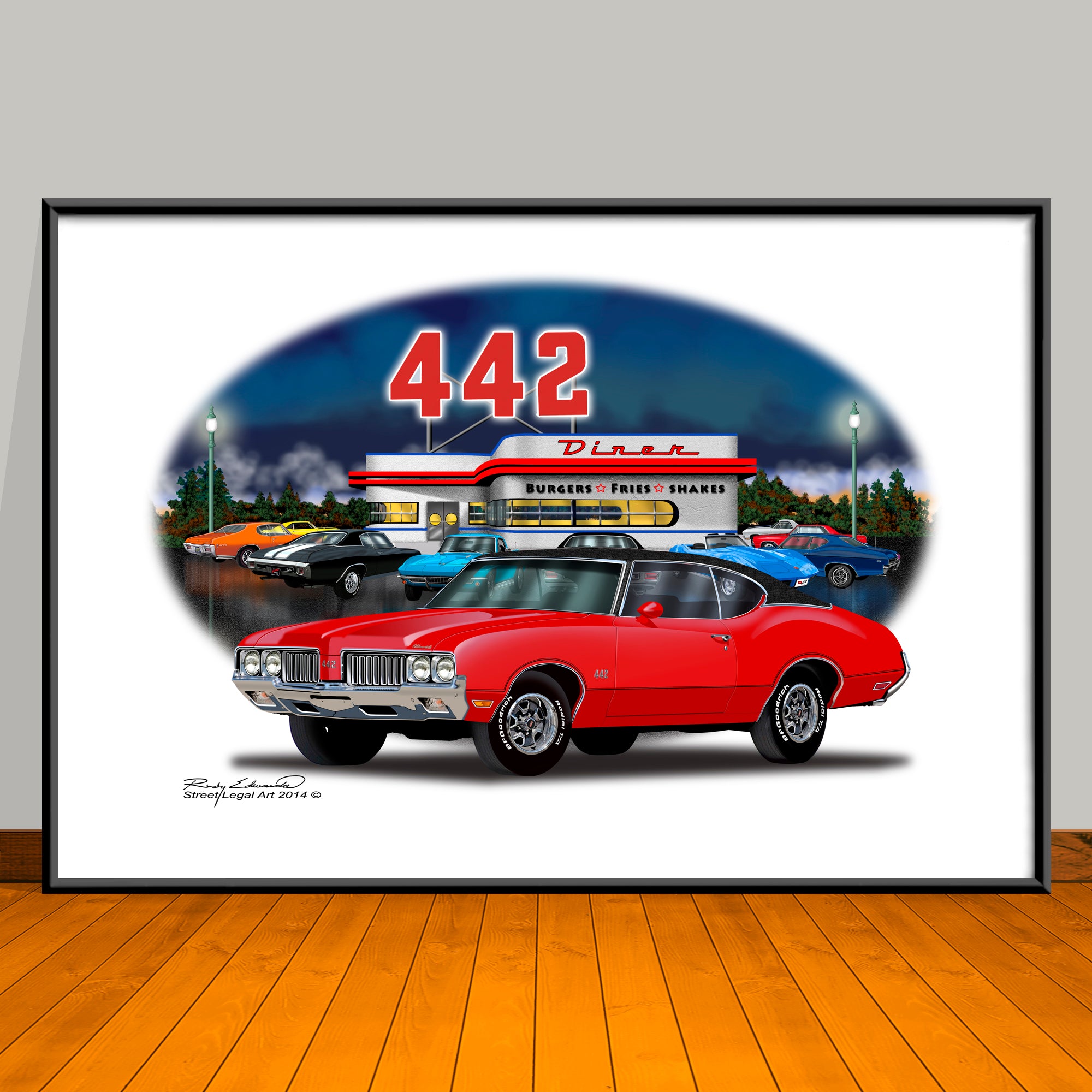 1970 Oldsmobile 442 Diner Vinyl Top Muscle Car Art Print - 13" X 19" UNFRAMED
